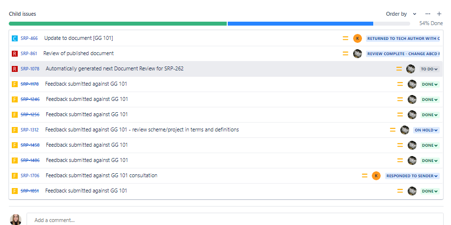 An epic contains no governance information and instead acts as the ‘parent’ issue for any associated actions to the document. If a change is made to the document, the epic will contain an associated ‘Change ABCD’ issue. The epic also shows any associated document reviews completed on the document or feedback items received: