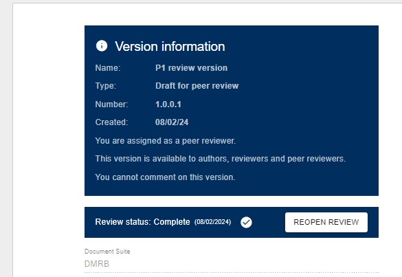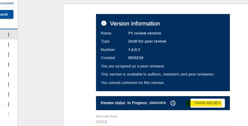 Where you have completed your review, please go back to the document information page at the top of the section list and press ‘finish review’. You can open this up again in future should you have pressed this in error.