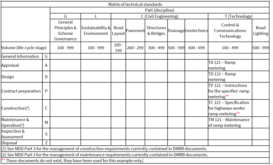 Using the proposed numbering system any ramp metering document would be T(x) 121 (where (x) defines the lifecycle stage). There may be subjects where it is not possible to follow the lifecycle through the matrix; contact TSG for help with any document numbering issues.