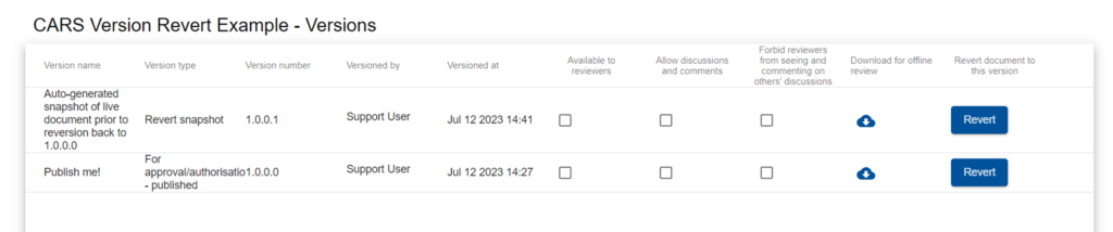CARS users with the Document “Reverter” role will have an additional option displayed against each of the items in the documents Versions list.