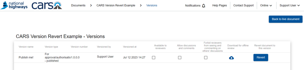 The CARS “Revert” functionality has been specifically implemented to support this type of scenario. This feature allows members of the National Highways (NH) Technical Standards Group (TSG) to restore the contents of a previous version of a CARS document in place of the current live document. This functionality does not wind the clock back; it simply replaces all contents of the current live document with the contents of the version selected to revert to; any versions “in between” remain in place. This means that the full history of authoring changes made is not lost.