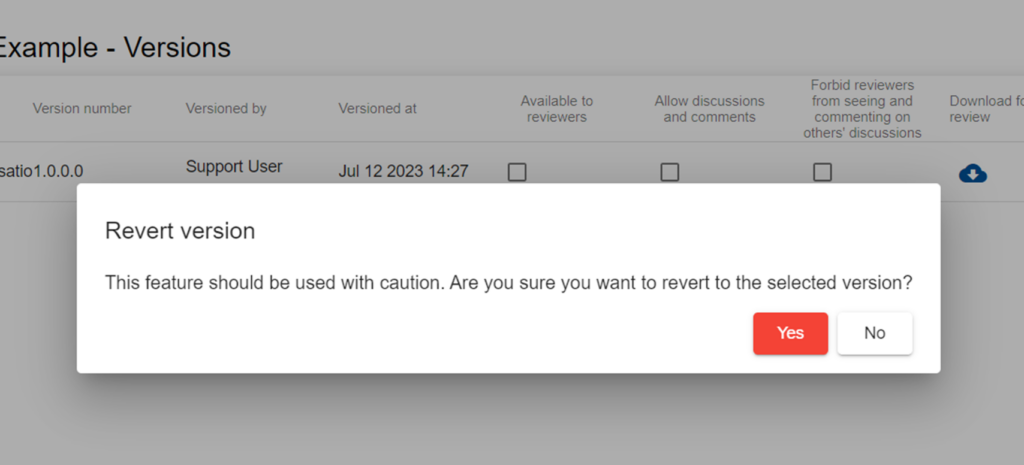 - Upon clicking “Revert” a modal will be displayed prompting for confirmation to continue with the revert. Click “Yes” to proceed.