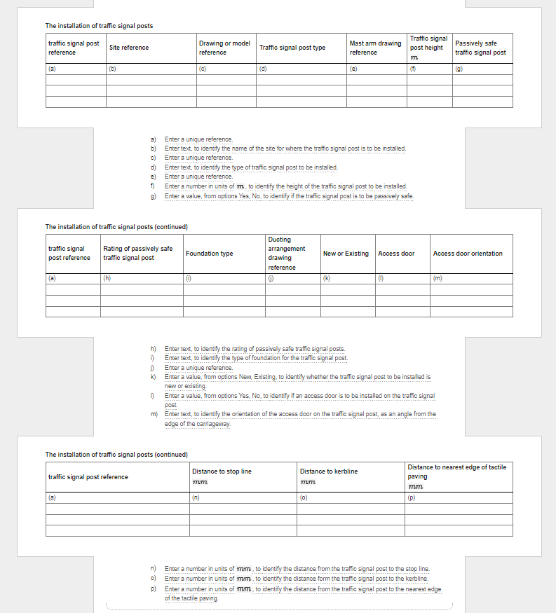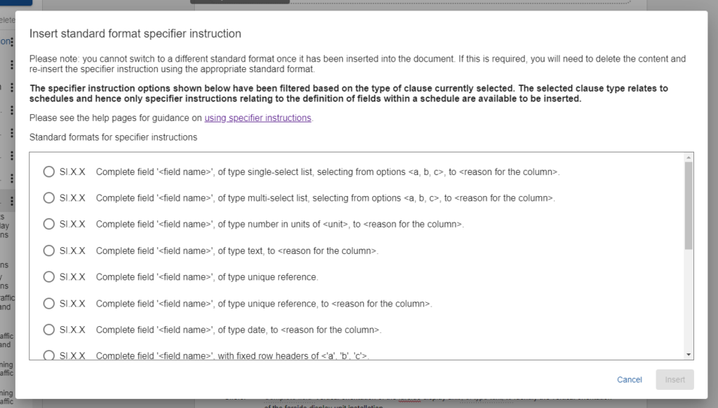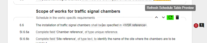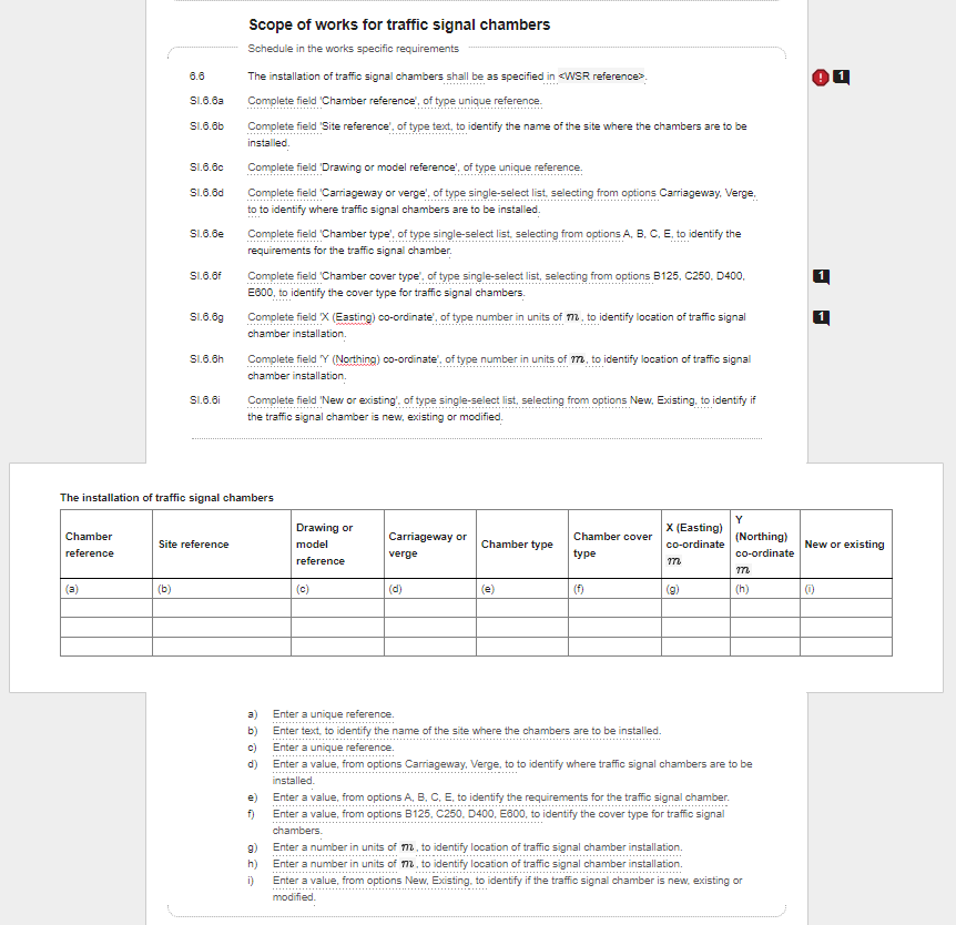 When a schedule based standard format requirement (SFR) is inserted into a MCHW document, the Technical Author has a selection of column defining specifier instructions (SI) to choose from. These outline the structure of the schedule to be completed by the Specifier within the relevant Works Specific Requirement (WSR) document.