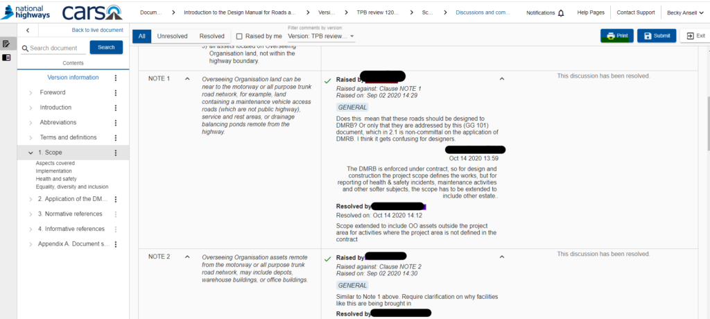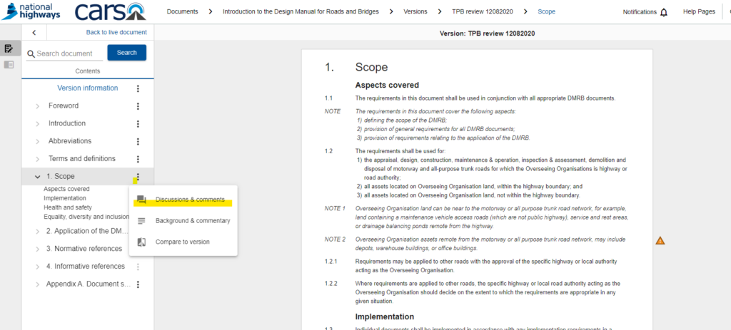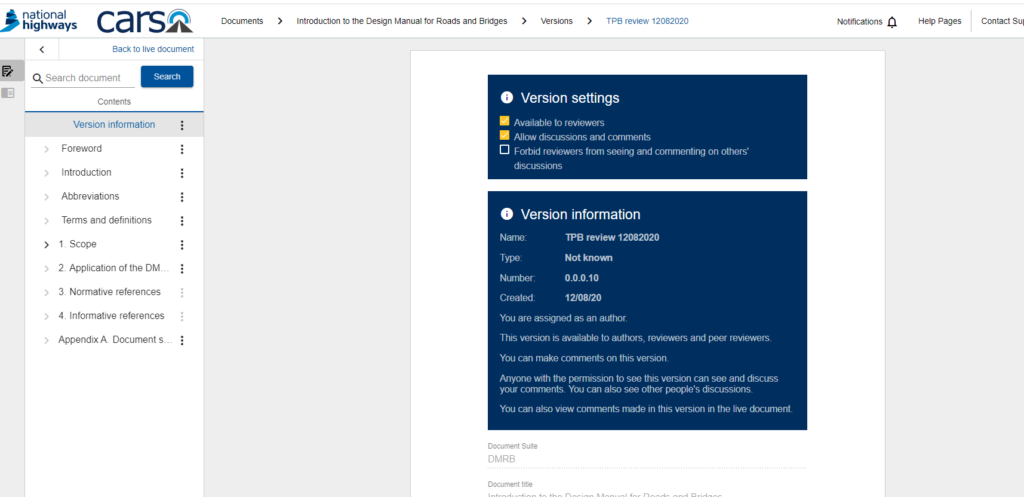 To export all discussions and comments received against a particular version of a document, i.e. a version used for a TSC consultation, please ensure the CARS document is opened up in the ‘version’ view rather than the live document: